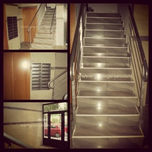 Hoy GRUPO GERSAN os muestra el resultado de la reforma integral de la entrada de una comunidad de vecinos situada en la ciudad de Elche – Alicante. Parece un simple cambio pero os vamos a poner en situación para que podáis comprobar que no es así. La situaciona inicial de este portal era de dos alturas diferentes, ya que para aceder a la puerta del ascensor habia que subir seis peldaños, los cuales fueron demolidos junto al forjado superior. Aprovechando que había sótano, se bajó la parada del ascensor y se amplió el primer tramo de escaleras del zaguán.