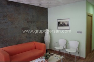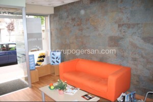 En la sala de espera podemos ver un una de las paredes revestida con un porcelánico con acabado óxido para dar un toque decorativo a esa zona de recepción.